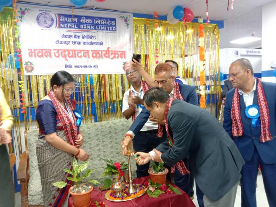 नेपाल बैंक लिमिटेड टीकापुर शाखा प्रबन्धक टेक बोहराको अध्यक्षतामा भएको कार्यक्रममा बैंकका केन्द्रिय कार्यकारी प्रमुख तिलकराज पाण्डेले १९९४ मा ८ लाख चुक्ता पुँजीबाट सुरु भएको नेपाल बैंकको चुक्ता पुँजी १६ अर्ब पुगेको बताएका छन् । भवनको उद्घाटन कार्यक्रममा बोल्दै कार्यकारी प्रमुख पाण्डेले बैंकमा दुई सय ८० अर्ब बचत रहेको बताउँदै दुई सय ७ अर्ब कर्जा लगानी गरेको बताएका छन् । देशभर ७१ जिल्लामा शाखा विस्तार गरेको बैंकले सुदुरपश्चिममा तीन जिल्ला र कर्णाली प्रदेशका तीन जिल्लामा शाखा विस्तार गर्न बाँकी रहेको बैंकका कार्यकारी अधिकृत पाण्डेको भनाइ छ ।