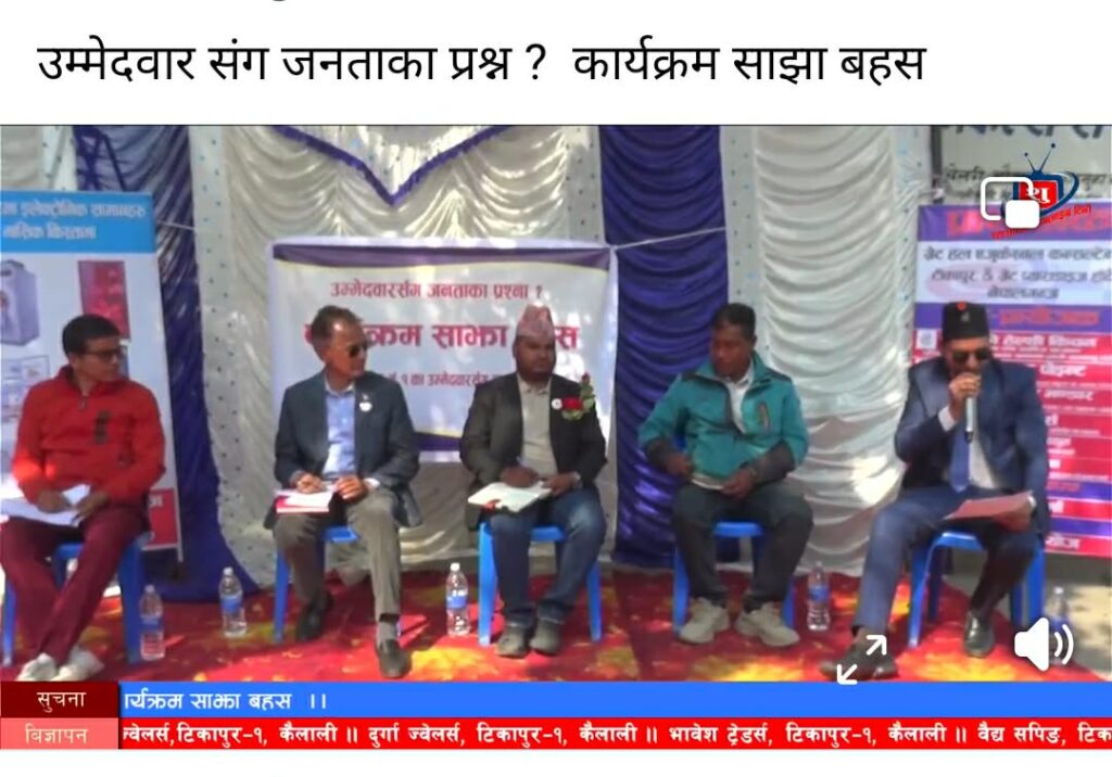 डिबेट कार्यक्रममा प्रगतिशील लोकतान्त्रिक पार्टीका जनकराज शाह, नेपाल कम्युनिस्ट पार्टी माओवादीका रामबहादुर विश्वकर्मा, उज्यालो नेपाल पार्टीका प्रदीप कुमार चौधरी, स्वतन्त्र उम्मेदवार नरेश रावल, आम जनता पार्टीबाट रुपाकुमारी चौधरी सहभागी भएका थिए । उनीहरूले टीकापुरलाई कृषि, पर्यटन र साना तथा मझौला उद्योगको केन्द्रका रूपमा विकास गर्न सकिने सम्भावनामा जोड दिएका छन् ।