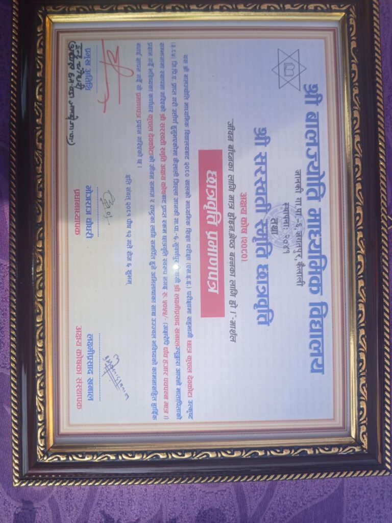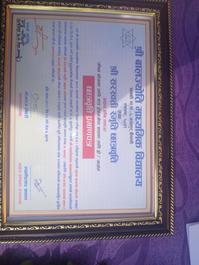 श्री सरस्वती स्मृति छात्रवृत्ति प्राप्त गर्ने बिद्यार्थीको सम्मानपत्र ।