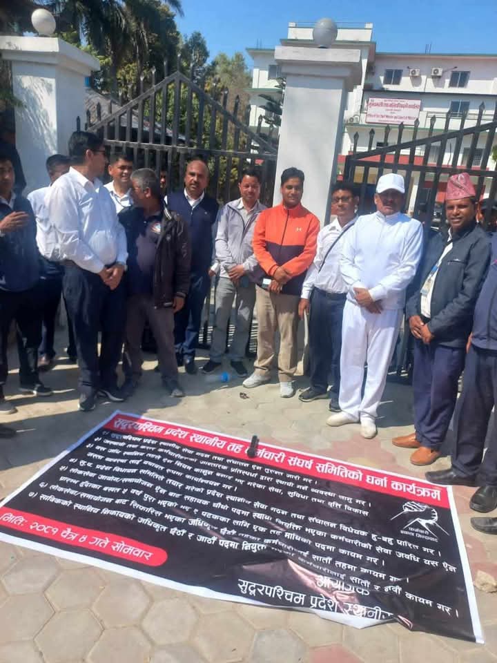 स्थानीय तहमा कार्यरत कर्मचारीले सुदुरपश्चिम प्रदेशको मुख्यमन्त्री तथा मन्त्रीपरिषद् कार्यालयमा धर्ना दिएका छन् ।