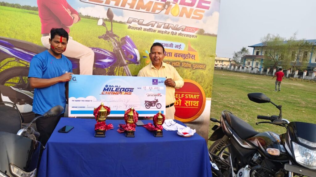 बजाज कम्पनीको प्लाटिना मोटरसाइकलको लाइलेज टेस्टमा लक्ष्मण चौधरी प्रथम भएका छन् ।
